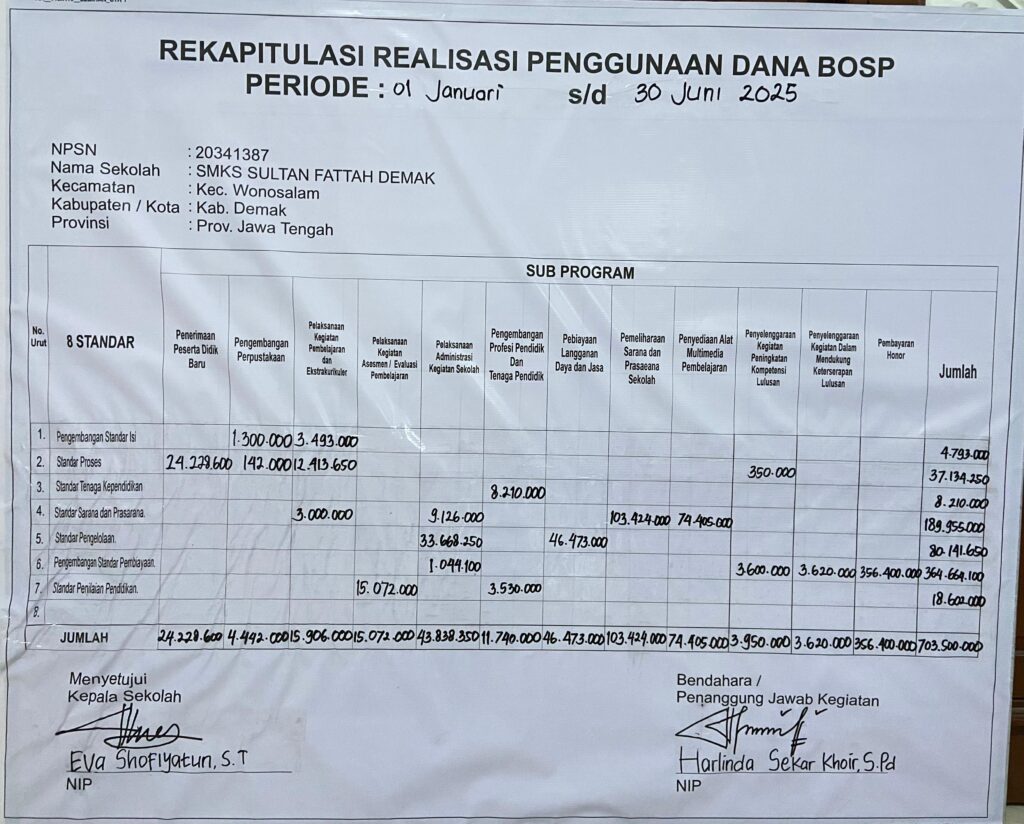 Rekapitulasi Realisasi Penggunaan Dana BOSP Periode 1 januari – Juni 2025